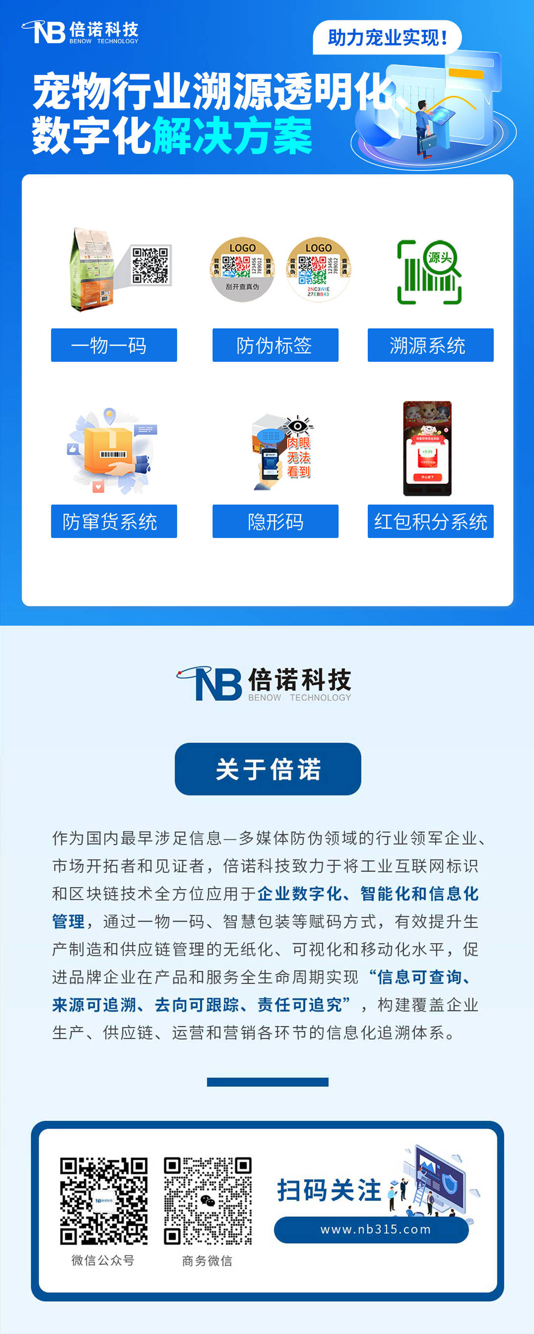 快速完成摆设。让每一份宠物食物都经得起“扫码”,倍诺科技以一物一码手艺为支点,而“逃溯系统扶植”则是守护这条生命线的最佳径。宠物已成为很多家庭的主要,从泉源到终端,“逃溯系统扶植”势正在必行——只要打通“从农田到食盆”的全链条数据,让品牌正在平安取信赖中行稳致远。